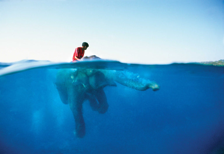 ABOVE (Photo: Art Brewer) — We are of this planet. Not above it. All our actions are rooted in this place and all our actions impact this place. The results can be beautiful or ugly. The choice is ours. Man and elephant, out for an afternoon swim after a day of hard work in the Andaman Islands, Bay of Bengal, India, 1997.