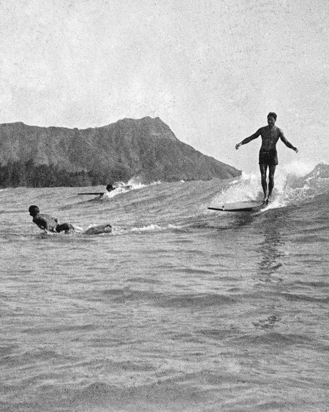 The artwork and images that enticed visitors to experience the inspiring allure of Waikiki's beaches pre-1935. Pan Am began offering commercial service to Hawaii in April of 1935. Before then, ocean liners could take you there, and this “Hawaii direct from Los Angeles” artwork adorned one of their brochures. The woodblock print on the back was illustrated in books of the time and looks like it was created from one of Tom Blake’s photographs.