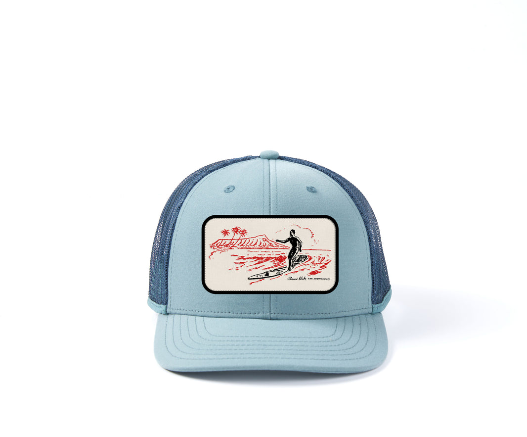 Our new Tom Blake graphic features an illustration from the 1950’s of a man surfing at Waikiki Beach with Diamond Head in the background.